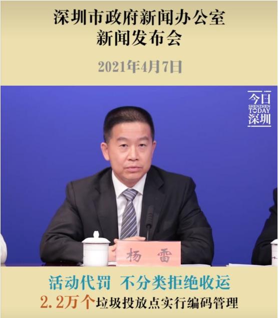 在今年4月初深圳召开的新闻发布会上,针对垃圾分类的实施问题,市城管和综合执法局副局长杨雷表示:自实施《深圳市生活垃圾分类管理条例》以来,约5500个小区和城中村已推行“集中分类投放和定时定点督导模式”,全市生活垃圾回收利用率稳定在40%以上,人人关注分类、参与分类的社会氛围在深圳初步形成。